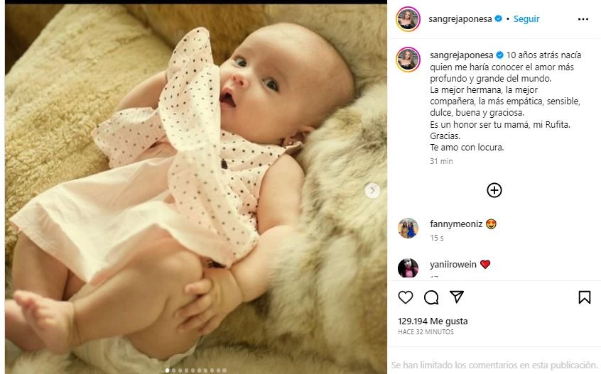 "10 años atrás nacía quien me haría conocer el amor más profundo y grande del mundo. La mejor hermana, la mejor compañera, la más empática, sensible, dulce, buena y graciosa. Es un honor ser tu mamá, mi Rufita. Gracias. Te amo con locura", escribió.
