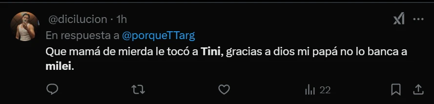 Las comparaciones siguieron con frases como "Que mamá de mierda le tocó a Tini, gracias a dios mi papá no lo banca a Milei". En las redes, la gente criticó tanto a Mariana como a Tini, asegurando que la cantante no tenía una postura clara sobre lo que estaba pasando. Algunos hasta dijeron que Tini estaba siguiendo a su madre en todo lo que hacía.