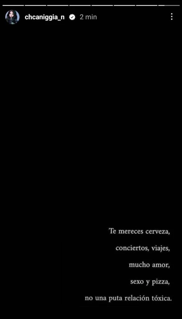 Sin embargo, durante las últimas horas soprendió a todos al compartir un misterioso y fuerte mensaje en su cuenta de Instagram donde se lee: "Te mereces cerveza, conciertos, viajes, mucho amor, sexo y pizza, no una puta relación tóxica". Pero no volvió a tocar el tema.