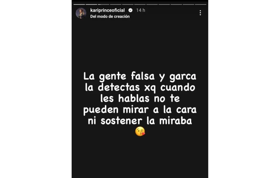 Esta vez el mensaje fue también por redes sociales y comentó: "La gente falsa y garca la detectas porque cuando les hablas no te pueden mirar a la cara ni sostener la mirada", afirmó Karina en una historia de Instagram donde solo salía el mensaje junto a un emoji de un beso.