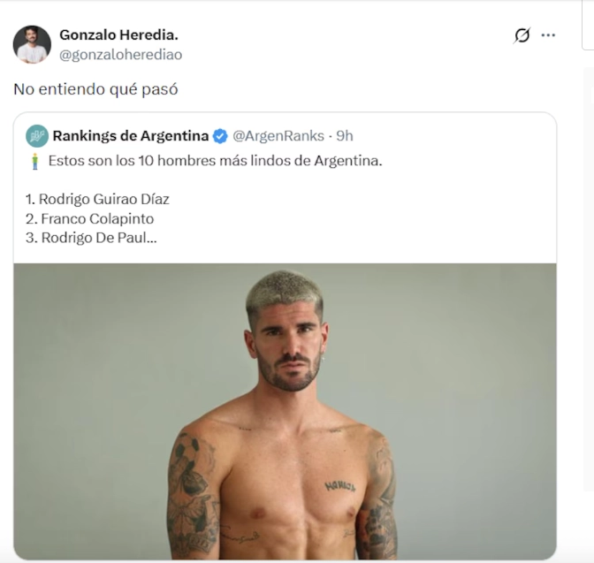 A ese posteo de Gonzalo se le añadieron comentarios de usuarios: “Soy estudiante de medicina, y quiero recordarte que prestes atención a los músculos de tu hombro izquierdo, especialmente la zona del trapecio para evitar la tensión. Es mejor no dormir de lado; idealmente, deberías dormir a mi lado”, “el ranking lo hizo un grupo de no videntes. Es obvio” y “en criollo, te cagaron”.
