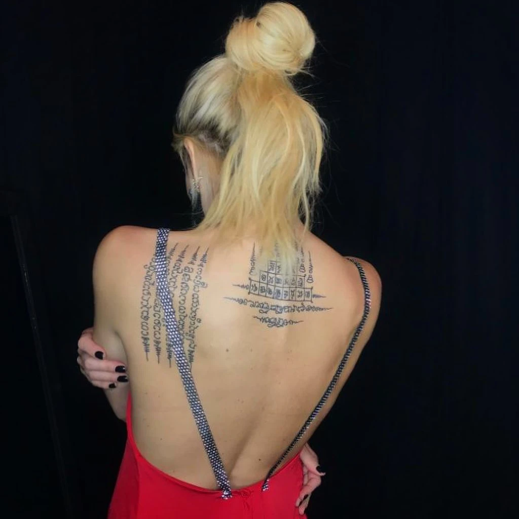 Cerca del hombro izquierdo, se ve en ambas mujeres una escritura que simboliza la bendición budista. Se realiza con una técnica, antigua y dolorosa, en donde se utiliza barras de acero con agujas quirúrgicas. El diseño trata de cinco bendiciones escritas en jemer, idioma de Camboya.