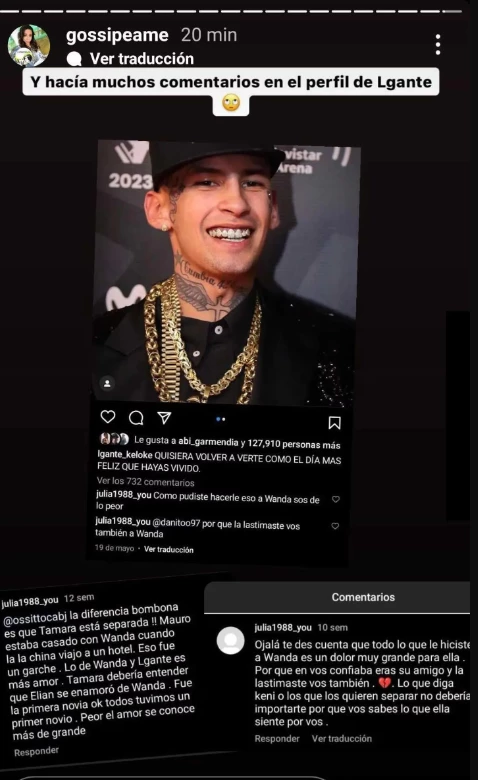 “Tamara está separada. Mauro estaba casado con Wanda cuando la China Suárez viajó a un hotel. Eso fue un garche. Lo de Wanda y L-Gante es más amor. Tamara debería entender que Elián se enamoró de Wanda. Fue la primera novia, ok. Todos tuvimos un primer novio, pero el amor se conoce de más grande”, decía uno de los comments.