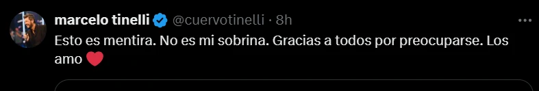 “Esto es mentira. No es mi sobrina. Gracias a todos por preocuparse. Los amo”, aseguró Marcelo Tinelli en la noche del lunes, alertado por una lluvia de comentarios en Twitter. Momentos más tarde, amplió su descargo con una nueva publicación.