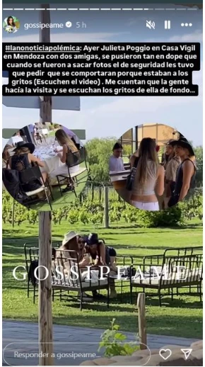 La cuenta Gossipeame describió la problemática de la ex Gran Hermano: “Ayer Julieta Poggio en Casa Vigil en Mendoza con dos amigas, se pusieron tan en dope que cuando se fueron a sacar fotos, el de seguridad les tuvo que pedir que se comportaran porque estaban a los gritos (escuchen el video)”.