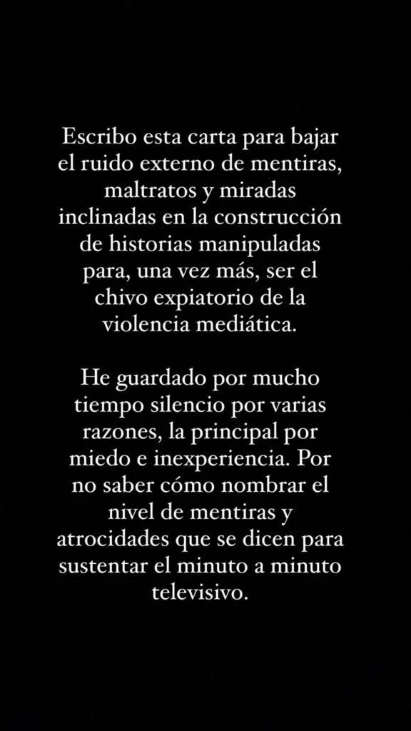 Asimismo, continuó: “He guardado por mucho tiempo silencio por varias razones, la principal por miedo e inexperiencia. Por no saber cómo nombrar el nivel de mentiras y atrocidades que se dicen para sustentar el minuto a minuto televisivo”.