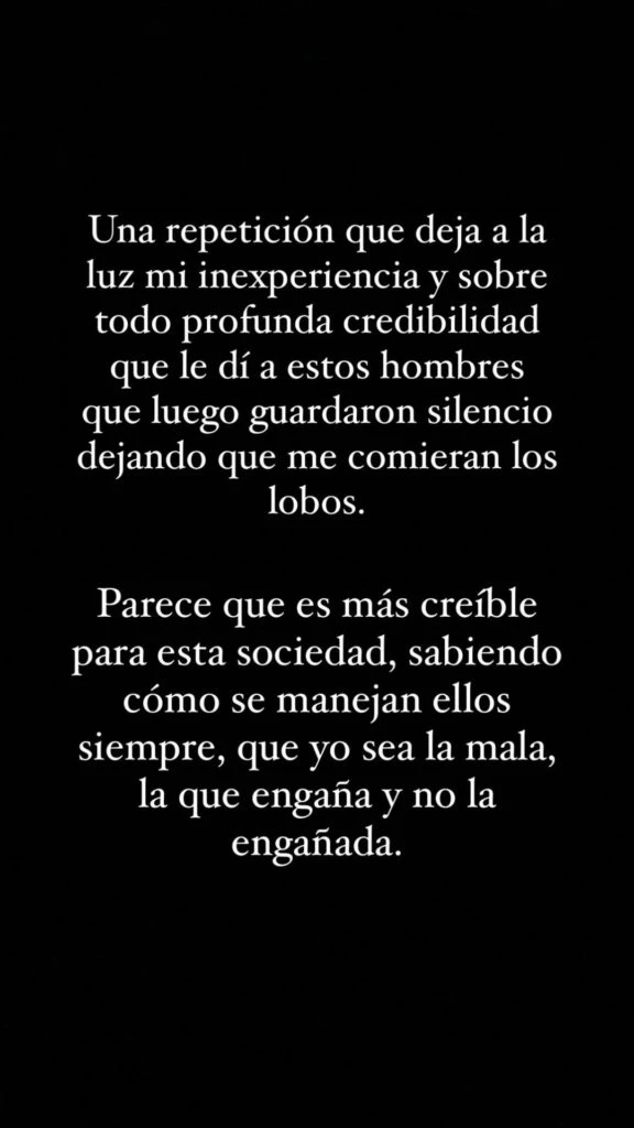“Una repetición que deja a la luz mi inexperiencia y, sobre todo, profunda credibilidad que le di a estos hombres que luego guardaron silencio dejando que me comieran los lobos. Parece que es más creíble para esta sociedad, sabiendo cómo se manejan ellos siempre, que yo sea la mala, la que engaña y no la engañada. Y también parece que es más fácil para una mujer pegarme a mí, para descargar”, agregó furiosa.