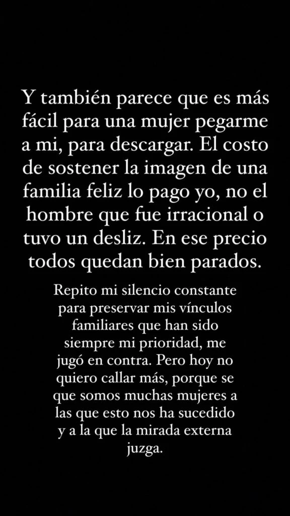 “Lo que está sucediendo hoy tiene detrás una historia mucho más grande y profunda de la que seguramente muchas mujeres van a sentirse identificadas. Me ha toca relacionarme con hombres a los que les he creído siempre sus palabras: que estaban separados o separándose y que no había conflictos”, escribió en una de sus stories.