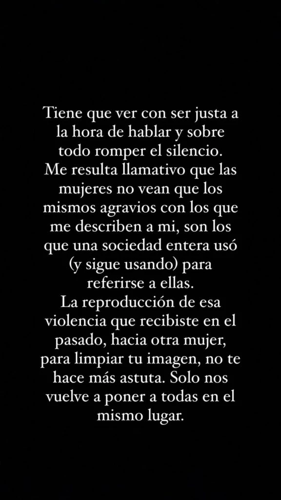“Como dicen ahora, ser empoderada no tiene que ver con dinero, con ser filosa en redes y menos con insultar con los mismos términos que te juzgaron en el pasado, a otra mujer. Tiene que ver con ser justa a la hora de hablar y sobre todo romper el silencio”