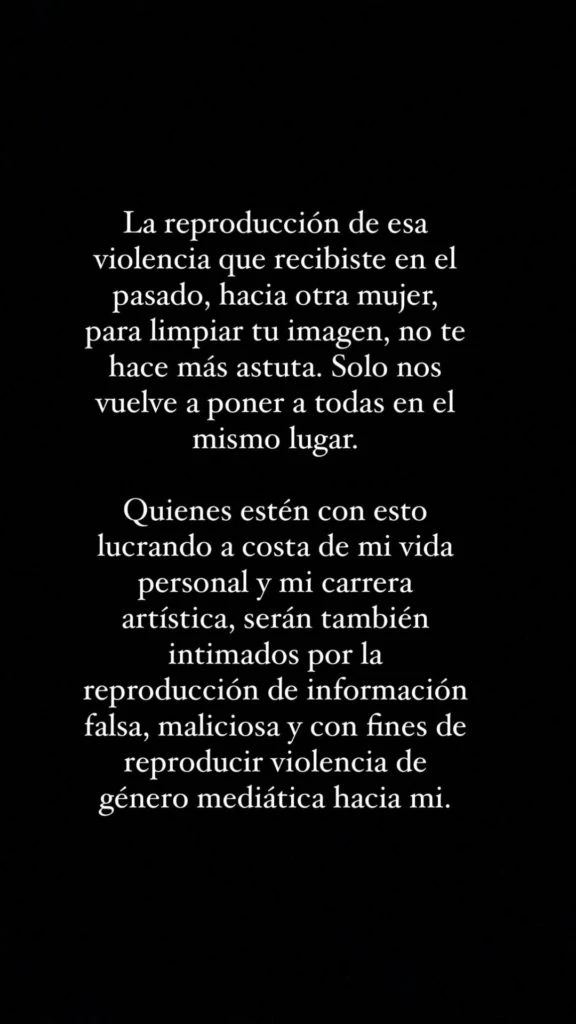 Dentro de este contexto, advirtió que tomará medidas legales contra los medios y las personas que circulen información falsa sobre ella: “Quienes estén con esto lucrando a costa de mi vida personal y mi carrera artística, serán también intimados por la reproducción de información falsa, maliciosa y con fines de reproducir violencia de género mediática hacia mí”.