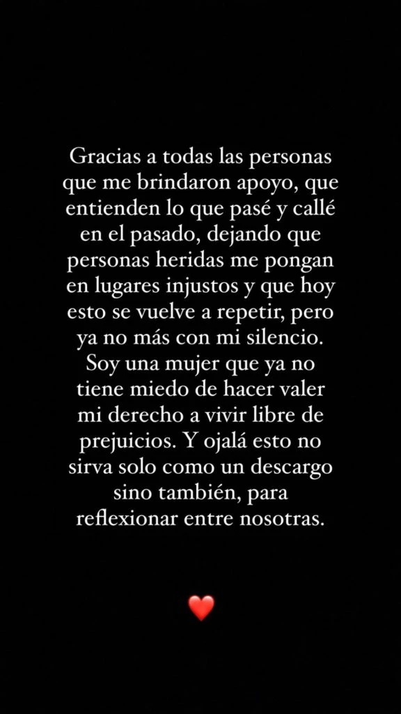 Y, para cerrar, agradeció el cariño recibido por algunos fanáticos y allegados a ella: “Gracias a todas las personas que me brindaron apoyo, que entienden lo que pasé y callé en el pasado, dejando que personas heridas me pongan en lugares injustos y que hoy esto se repita. Pero ya no más con mi silencio. Soy una mujer que ya no tiene miedo de hacer valer mi derecho a vivir libre de prejuicios. Y ojalá esto no sirva solo como un descargo, sino también, para reflexionar entre nosotras”.