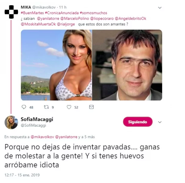 Lejos de quedarse en el molde, ella le hizo frente y se mostró enojadísima: "¿Por qué no dejás de inventar pavadas? ¡Ganas de molestar a la gente! Y si tenes huevos arrobame, idio...".