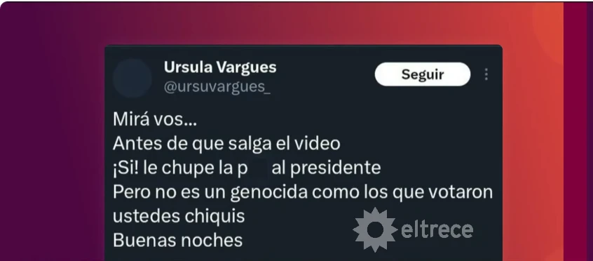 “Mirá vos, antes que salga el video. ¿¡Si! Le chupé la p… al presidente, pero no es un genocida como el que votaron ustedes chiquis. Buenas noches”, publicó Vargues en su cuenta oficial de esa plataforma digital, aunque luego decidió eliminarlo.