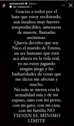 En el post, Nicolás expresó su malestar ante los insultos, amenazas de muerte y llamadas anónimas que ha estado recibiendo desde la permanencia de Emmanuel en la casa. "Quería decirles que soy Nico, el marido de Emma, un ser humano que está acá afuera en la vida real", comenzó diciendo en su mensaje.