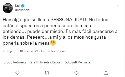 "Hay algo que se llama PERSONALIDAD. No todos están dispuestos a ponerla sobre la mesa, entiendo, puede dar miedo. Es más fácil parecerse a los demás. Pero a mí y a los míos nos gusta ponerla sobre la mesa", escribió dejando en claro que seguirá fiel a su estilo musical. ¡Directa!