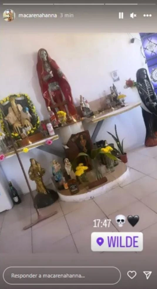 San la Muerte fue el santo elegido por la joven, luego de publicar en sus historias de Instagram una foto de apoyo al cantante, en la otra se mostró un altar con una estatua alta situada en el medio con flores amarilla y un licor en modo de ofrenda. En la mesita también se encontraba la Virgen María y una figura hindú.