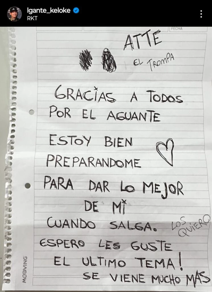 El intérprete de "El último romántico" publicó una foto en la que escribió en la hoja de un cuaderno con su puño y letra en mayúscula un mensaje de agradecimiento a quienes le han dado su apoyo: "GRACIAS A TODOS POR EL AGUANTE. ESTOY BIEN PREPARANDOME PARA DAR LO MEJOR DE MÍ CUANDO SALGA. ESPERO LES GUSTE EL ÚLTIMO TEMA!. SE VIENE MUCHO MÁS".