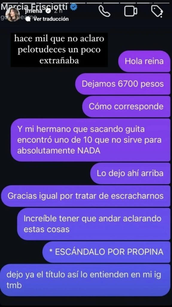 La actriz también hizo un llamado a los “curiosos” para que investiguen el monto de la propina por sí mismos. “Y de paso lo curiosos que están al dope, les escriben y averiguan cuánta propina dejamos”. Hasta el momento Pochi de Gossipeame no dijo nada al respecto.