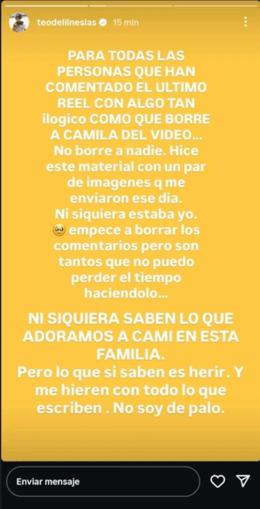 Furiosa, la esposa de Benjamín decidió compartir un fuerte descargo: "Para todas las personas que han comentado el último reel con algo tan ilógico como que borré a Camila del video... No borre a nadie. Hice este material con un par de imágenes que me enviaron ese día. Ni siquiera estaba yo".
