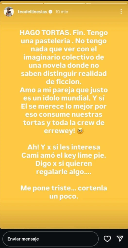 "Amo a mi pareja que justo es un ídolo mundial. Y sí, él se merece lo mejor, por eso consume nuestras tortas y toda la crew de Errewey. ¡Ah! Y por si les interesa, Cami amó el key lime pie. Digo por si quieren regalarle algo", continuó en el descargo que compartió.