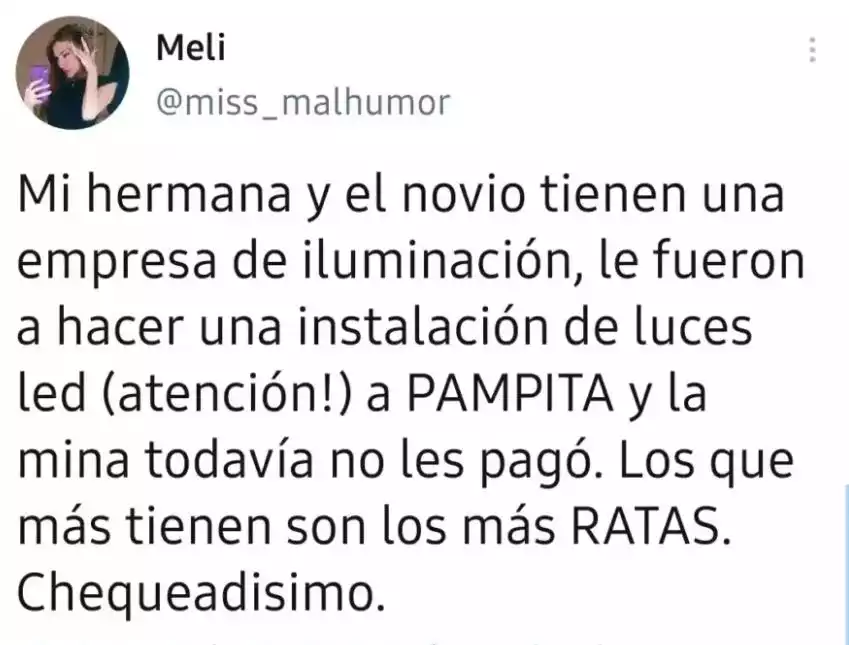 "Ya mismo estoy hablando con mi novia, que hable con su hermana para que se retracte. Qué vergüenza, no sé cómo pedirte disculpas", le contestó el electricista, tras dejar en claro que la demora en el cobro había corrido por su cuenta.