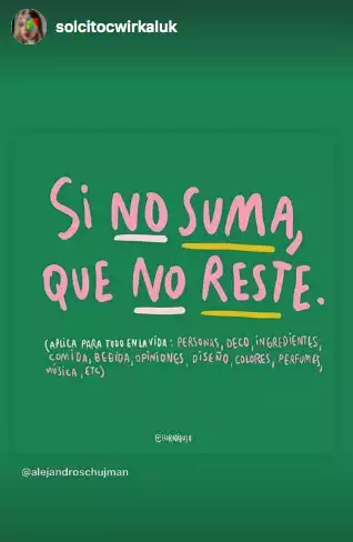 Además, la incipiente cantante dejó un sentido mensaje en sus historias de Instagram, en donde replicó una publicación de otro usuario que citaba que “si no suma, que no reste”: “Aplica para todo en la vida. Personas, deco, ingredientes, comida, bebida, opiniones, diseño, colores, perfumes, música, etc.”.