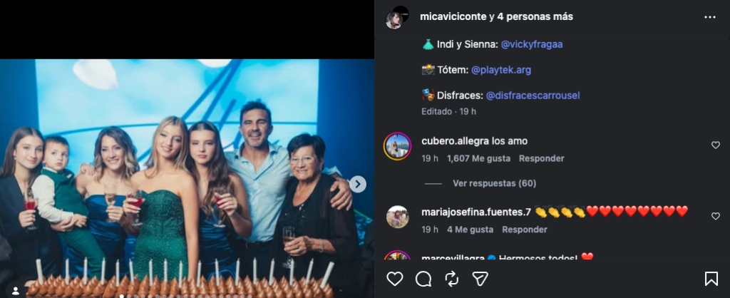 En este punto, Viciconte hizo un fuerte posteo sobre lo que dejó la fiesta de Allegra. “Una fiesta inolvidable, de esas que te hacen valorar las cosas lindas, los momentos compartidos y la gente que querés”, escribió. Y más allá de que en el mismo texto hizo una extensa lista de agradecimientos a las diferentes marcas que actuaron como canje, lo que llegó después fue más fuerte.