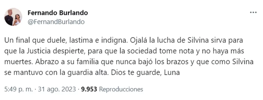 Eso no fue todo porque Fernando Burlando decidió finalizar con un mensaje dedicado a Silvina Luna, quien luchó años por su vida para poder mejorar y tener la vida que siempre soñó: "Abrazo a su familia que nunca bajó los brazos y que como Silvina se mantuvo con la guardia alta. Dios te guarde, querida Silvina Luna”.