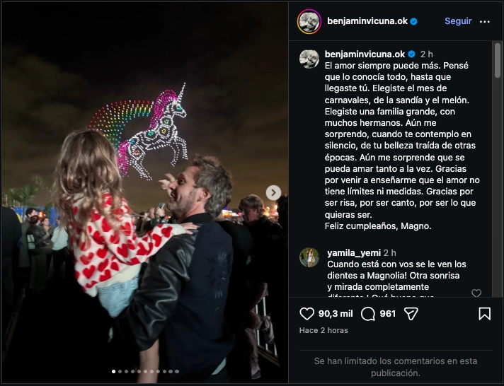 “Feliz cumpleaños, Magno”, cerró Vicuña su tierno mensaje, como parte de una declaración de amor y deseo de felicidad hacia su hija que solo pueden entender quienes viven la paternidad como él. Se sabe que el chileno extraña mucho a sus dos hijos más pequeños, y sin dudas estos deben ser momentos de absoluta fragilidad y sensibilidad para él.