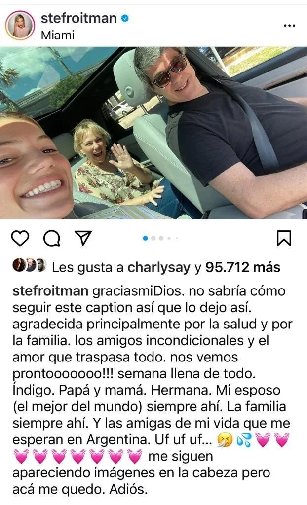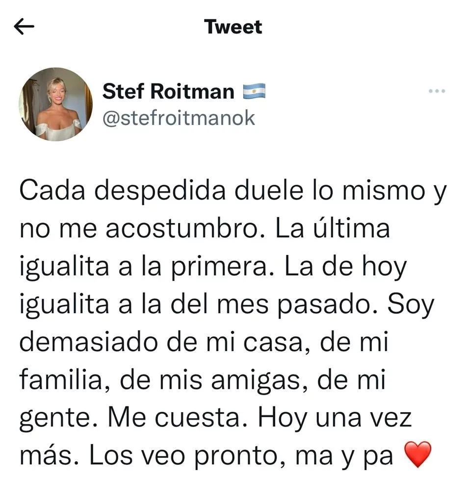 "Cada despedida duele lo mismo y no me acostumbro. La última igualita a la primera .La de hoy igualita a la del mes pasado. Soy demasiado de mi casa, de mi familia, de mis amigas, de mi gente. Me cuesta. Hoy una vez más. Los veo pronto, ma y pa", fue el mensaje de Stefi que levantó dudas de una mala convivencia en Miami.