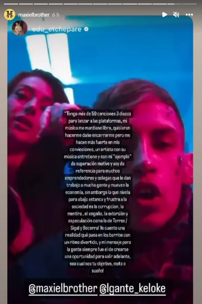 A través de la cuenta de su representante Maxi el Brother, subió una historia con un mensaje para limpiar su imagen. El comunicado comenzó: “Tengo más de 50 canciones, 3 discos para lanzar a las plataformas, mi música me mantiene libre, quisieron hacerme daño, encerrarme, pero me hacen más fuerte en mis convicciones” en referencia a los dos empleados municipales que lo acusaron.