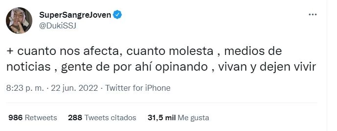 "Lo peor es que ni ven cuánto nos afecta, cuánto molesta, medios de noticias, gente de por ahí opinando; vivan y dejen vivir", cerró Duki, dejando en claro que su noviazgo con Emi sigue firme, mientras que ella cada vez que tiene oportunidad dice lo enamorada que está de su pareja.