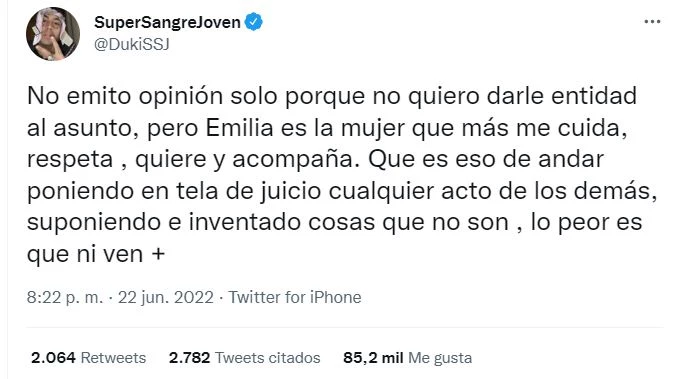Y dijo más: "No emito opinión solo porque no quiero darle entidad al asunto, pero Emilia es la mujer que más me cuida, respeta , quiere y acompaña. Qué es eso de andar poniendo en tela de juicio cualquier acto de los demás, suponiendo e inventado cosas que no son".
