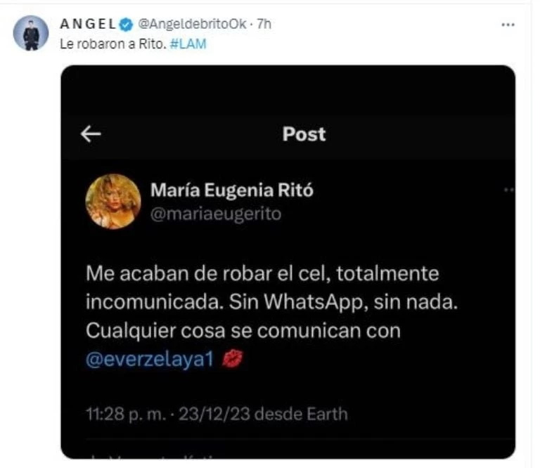 A través de su cuenta de X (ex Twitter) la vedette confirmó: “Me acaban de robar el celular, totalmente incomunicada. Sin WhatsApp, sin nada. Cualquier cosa se comunican con Ever Zelaya”. A su vez, Ángel de Brito compartió el mensaje para darle más visibilidad.