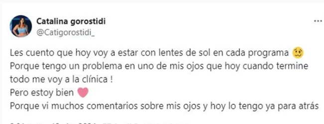 La enemiga de Furia agarró su celular, abrió la aplicación de Twitter y se predispuso a escribir unas líneas para informarle al mundo, y a sus seguidores, esta calamidad. “Les cuento que hoy voy a estar con lentes de sol en cada programa. Porque tengo un problema en uno de mis ojos”, arrancó.