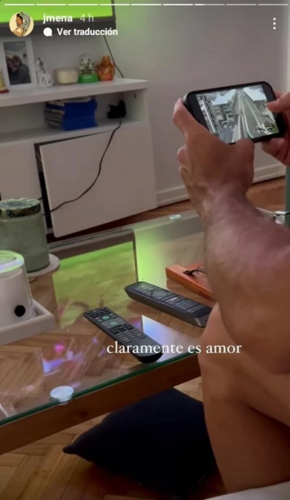 En la primera imagen se los puede ver a ambos mirando un partido de fútbol y en la segunda imagen se ve también la mano de su novio con su celular y mirando una carrera de autos.
