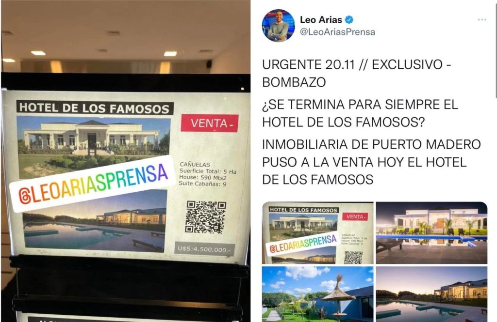 El periodista de Crónica, Leo Arias, fue quien arrojó esta información a través de su cuenta de twitter donde escribió: “Urgente 20.11. Exclusivo - Bombazo ¿Se termina para siempre El Hotel de los famosos? Inmobiliaria de Puerto Madero puso a la venta hoy al hotel”.