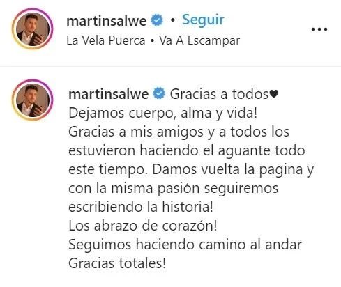 Reflexionando sobre todo lo qué pasó dentro del programa, Martín, escribió: “Gracias a todos. Dejamos cuerpo, alma y vida. Gracias a mis amigos y a todos los estuvieron haciendo el aguante todo este tiempo". Asimismo, continuó: “Damos vuelta la página y con la misma pasión seguiremos escribiendo la historia".