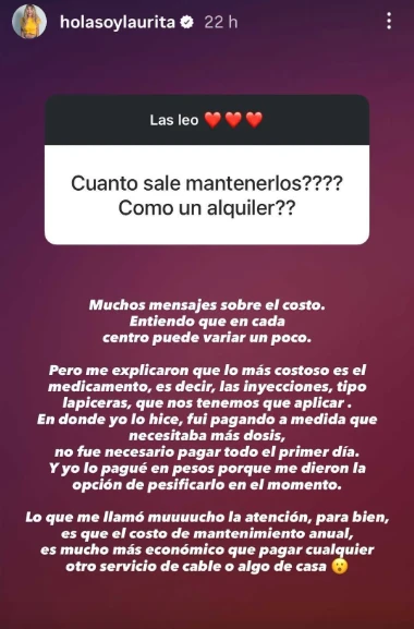 Todo surgió en Instagram, cuando una usuaria le preguntó: “¿Cuánto sale mantenerlos, como un alquiler?”. Sin vuelta alguna, Laurita aclaró que no hay un valor único y que cada clínica maneja montos diferentes: “Muchos mensajes sobre el costo. Entiendo que en cada centro puede variar un poco”, explicó.