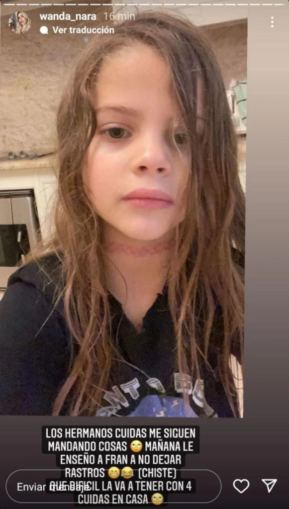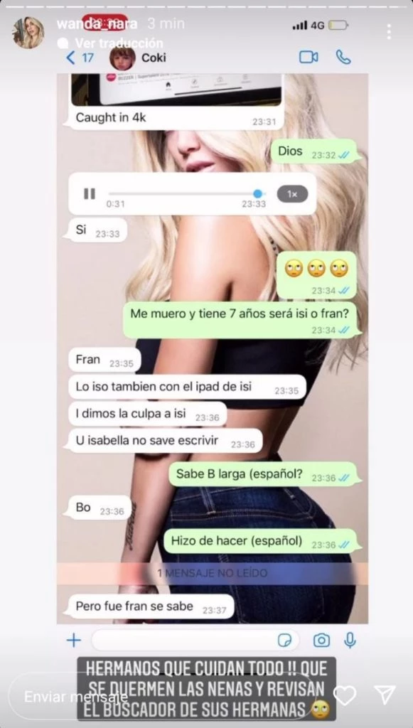 Luego, subió una fotografía de Francesca Icardi, quien antes de dejar de usar el dispositivo se tomó una fotografía y señaló: "Los hermanos cuidas me siguen mandando cosas, mañana le enseño a Fran a no dejar rastros (chiste). Qué difícil la va a tener con cuatro cuidas en casa".