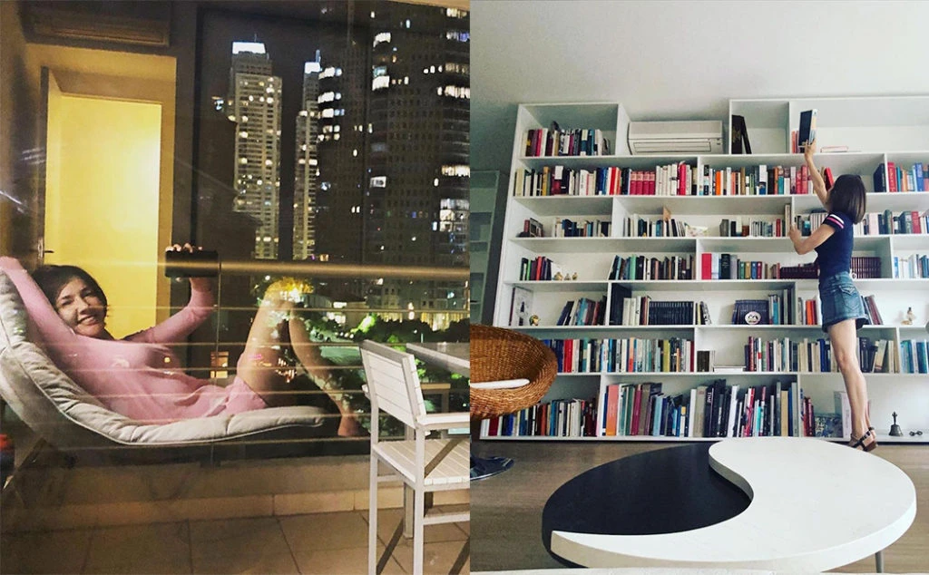 Y para hacerlo elige distintos rinconcitos de su glamorosa casa en donde se hizo hacer, a medida, una gran biblioteca de pared a pared, en color blanco, en la que, también, incluyó adornos.
