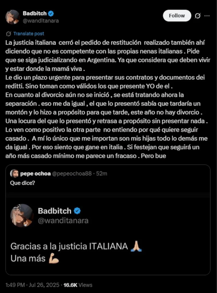 Sin embargo, Wanda festejó una nueva victoria en los tribunales italianos. La empresaria compartió detalles del fallo que consideró un golpe directo a las intenciones de Icardi: “La Justicia italiana cerró el pedido de restitución realizado también ahí diciendo que no es competente con las propias nenas italianas".