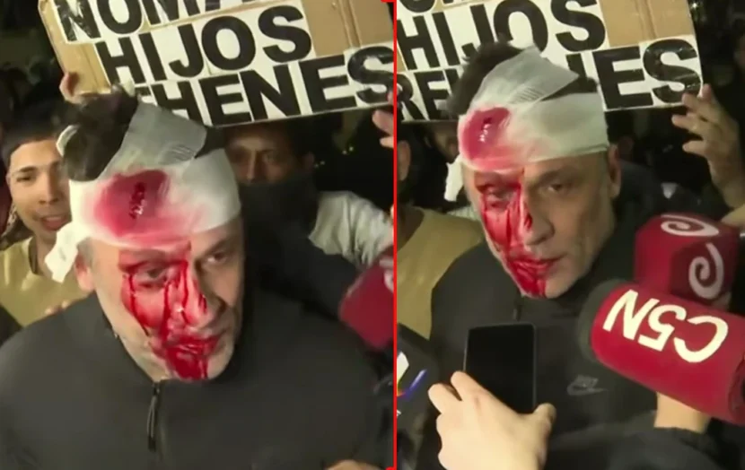Incluso, el periodista tuvo el gesto de detenerse y dialogar con sus colegas. Con el rostro ensangrentado, y una improvisada venda en su cabeza, el agredido contó: “Una botella, estaba haciendo una entre a los encapuchados y me voló una botella”.