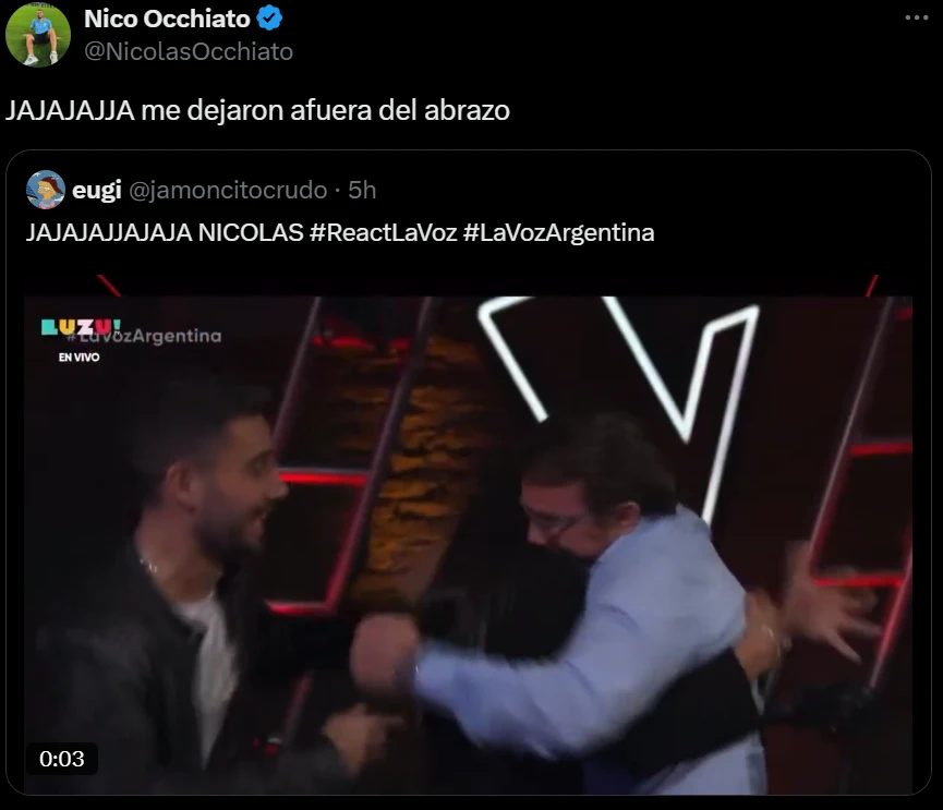 Lejos de tomarlo a mal, Nico Occhiato lo tomó con mucho humor y decidió postear en sus redes sociales el video y escribir: "JAJAJAJJA me dejaron afuera del abrazo". Fue entonces que recibió cientos de comentarios apoyando su gesto y reacción.