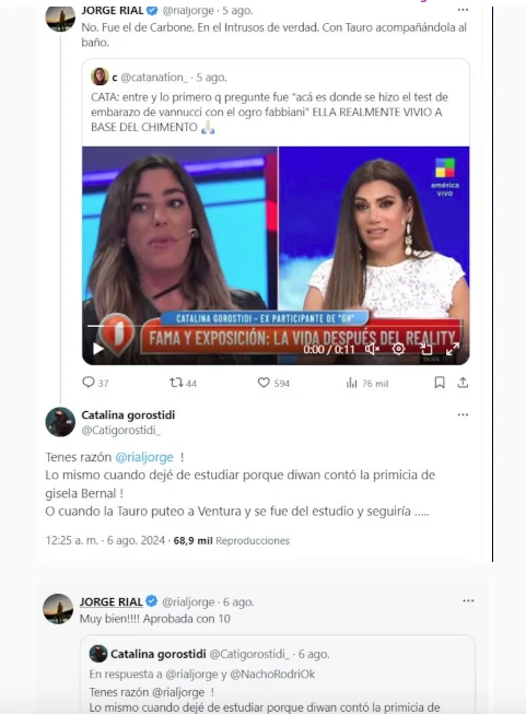 Así se abrieron las puertas a un feedback entre la ex amiga de Furia y el periodista, ya que la morocha le escribió: “Tenés razón, Jorge. Lo mismo cuando dejé de estudiar porque Diwan contó la primicia de Gisela Bernal. O cuando Tauro puteó a Ventura y se fue del estudio”.