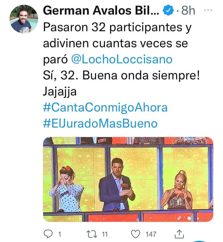 "Pasaron 32 participantes y adivinen cuantas veces se paró @locholoccisano. Si, 32. Buena onda siempre ! jajaj", compartió Germán Avalos, desde su cuenta de Twitter, remarcando la actitud de Loccisano.