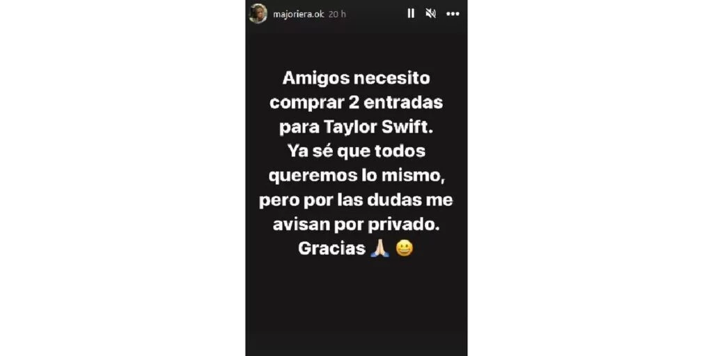 Majo Riera decidió comenzar a escribir mediante su cuenta de Instagram: "Amigos, necesito comprar dos entradas para Taylor Swift". Eso no fue todo porque la madre de Lali Espósito fue por más y decidió mostrarse empática con los fanáticos que no consiguieron entradas.