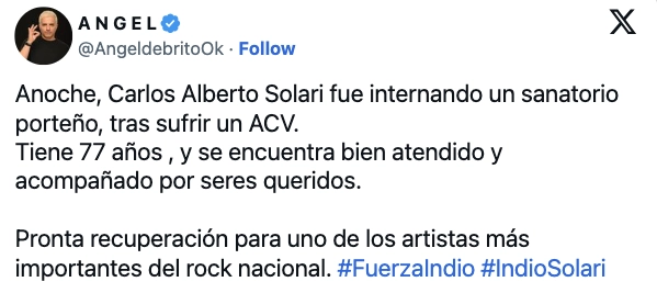 Desde su cuenta en X , de Brito escribió: “Anoche, Carlos Alberto Solari fue internado en un sanatorio porteño, tras sufrir un ACV. Tiene 77 años, y se encuentra bien atendido y acompañado por seres queridos.” Además, agregó: “Pronta recuperación para uno de los artistas más importantes del rock nacional.”