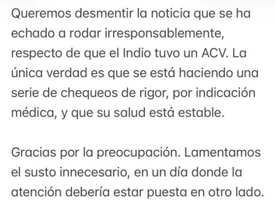 “Queremos desmentir la noticia que se ha echado a rodar irresponsablemente, respecto de que el Indio tuvo un ACV. La única verdad es que se está haciendo una serie de chequeos de rigor, por indicación médica, y que su salud está estable”, escribieron desde la cuenta oficial del Indio.