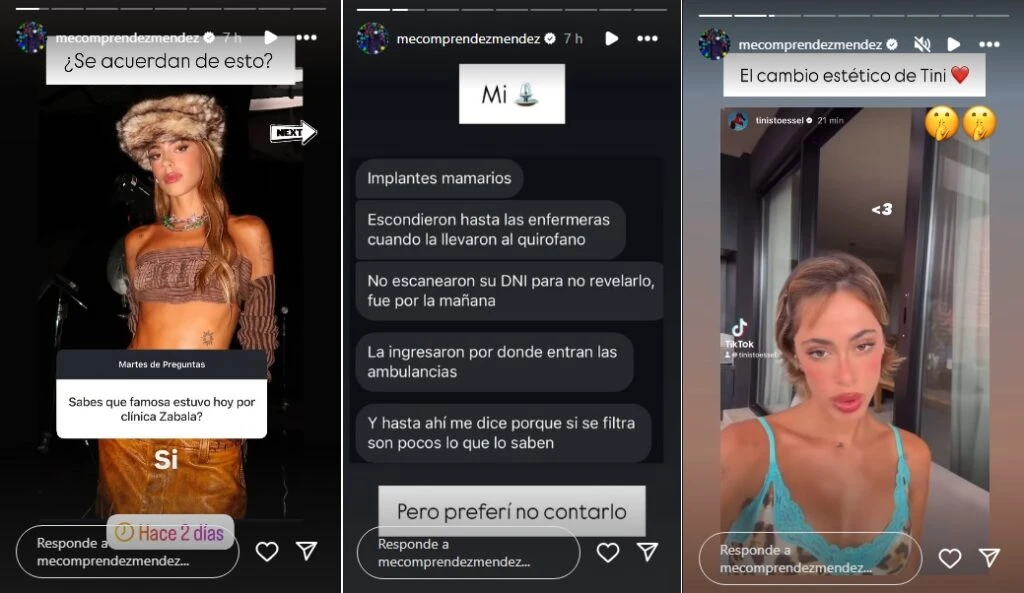 La información se dio a conocer a través de un periodista de El Nueve que reveló a través de sus historias de Instagram que Tini se hizo un cambio estético. La cantante se puso "implantes mamarios" y publicó el video en el que se puede apreciar el retoque. Por supuesto, los comentarios no tardaron en llegar.